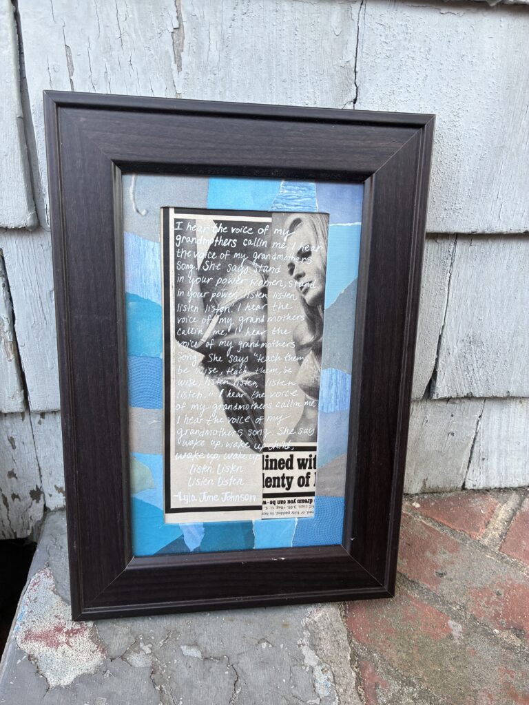 ‘Grandmothers ,’ 2025. 6″ x 20″ Mixed media, framed in glass and wood. $40