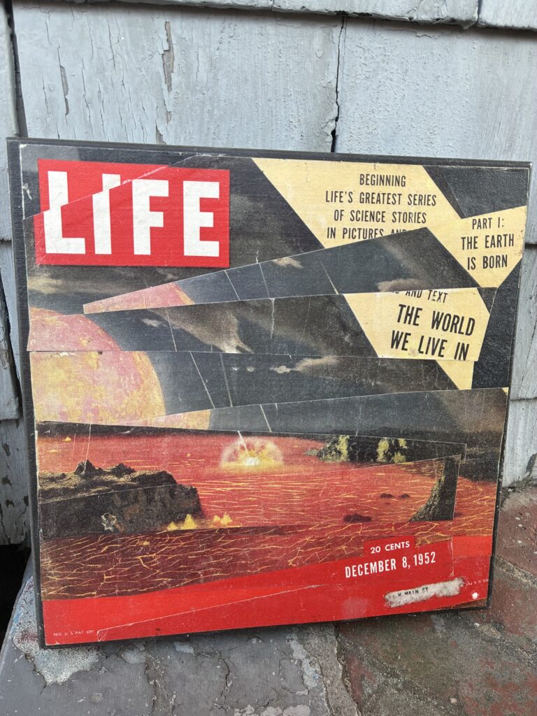‘The World ,’ 2025. 12″ x 12″ Mixed media on wood with water-resistant seal. Original 1952 LIFE cover. $40