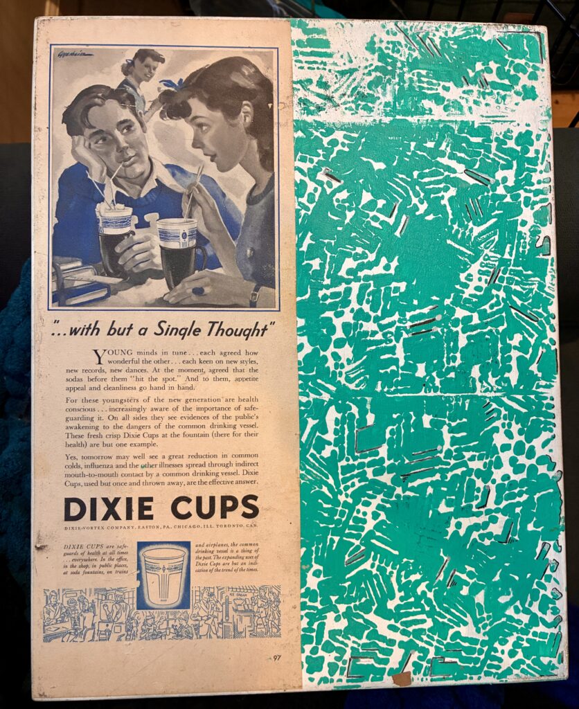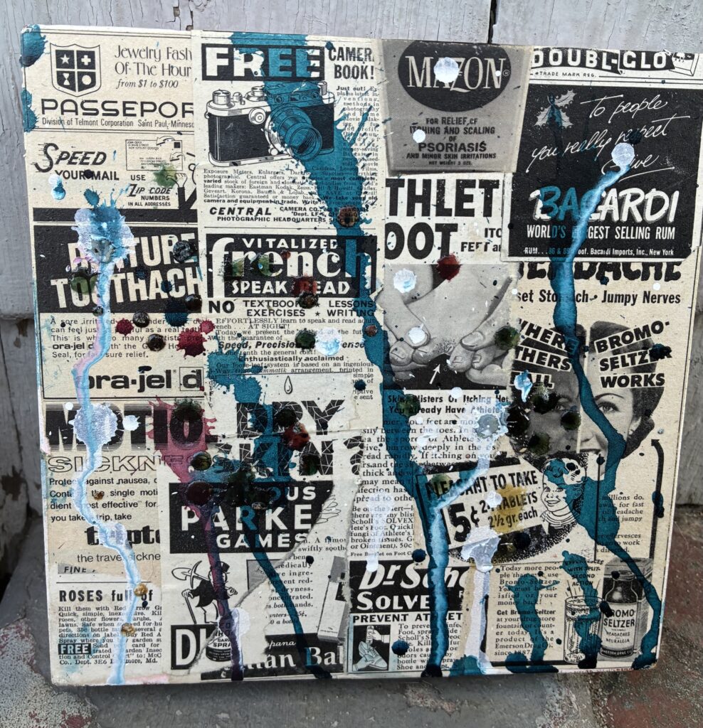 ‘Buy Me,’ 2025. 8″ x 8″ Mixed media on wood with water-resistant seal. Original mid-century LIFE Ads. $40
