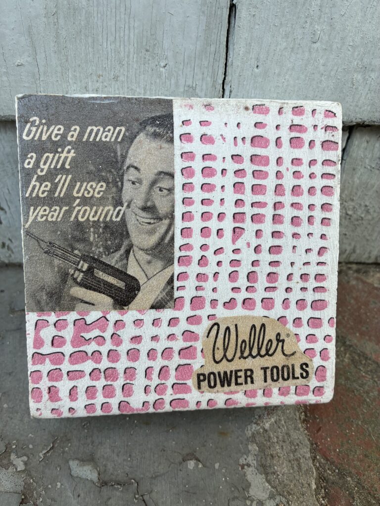 ‘Gifts for Men’, 2025. 5″ x 5″. Mixed media and gauche on wood withwith water-resistant seal. Original mid-century LIFE Ad. $20