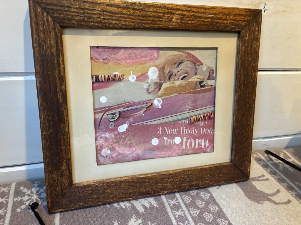 ‘Pink Lady,’ 2025. Glass framed original LIFE magazine ad with mixed media, 1960s, in high quality wood frame. 8.5″ x 7.5 ” (picture) 14.5 x 12,5 (Frame). $50