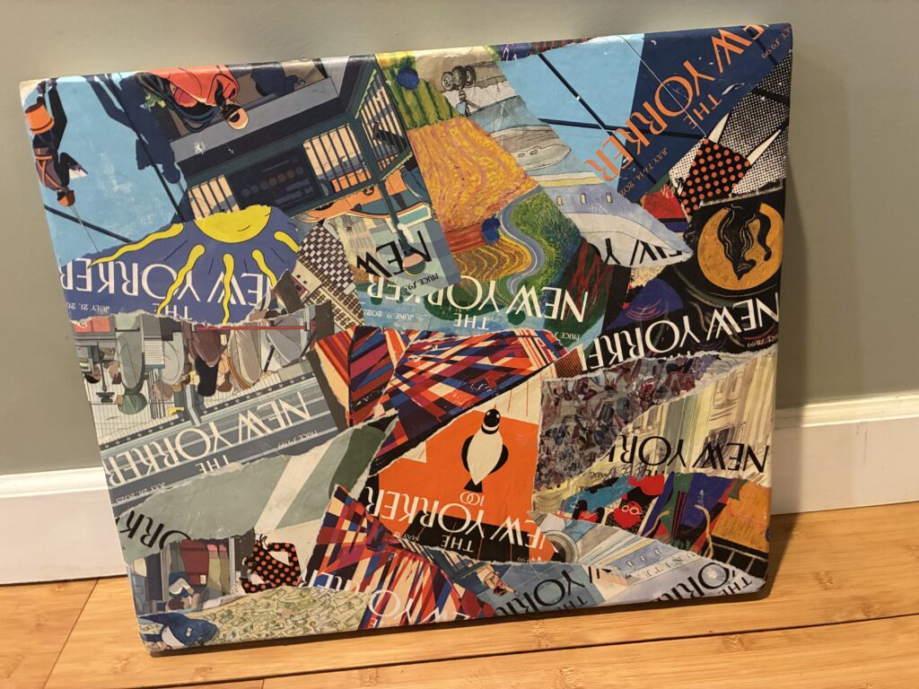 ‘All the New Yorkers I Never Read,’ 2025. Mixed media and matte medium on wood, with water-resistant seal. 2′ x 3′ . $120
