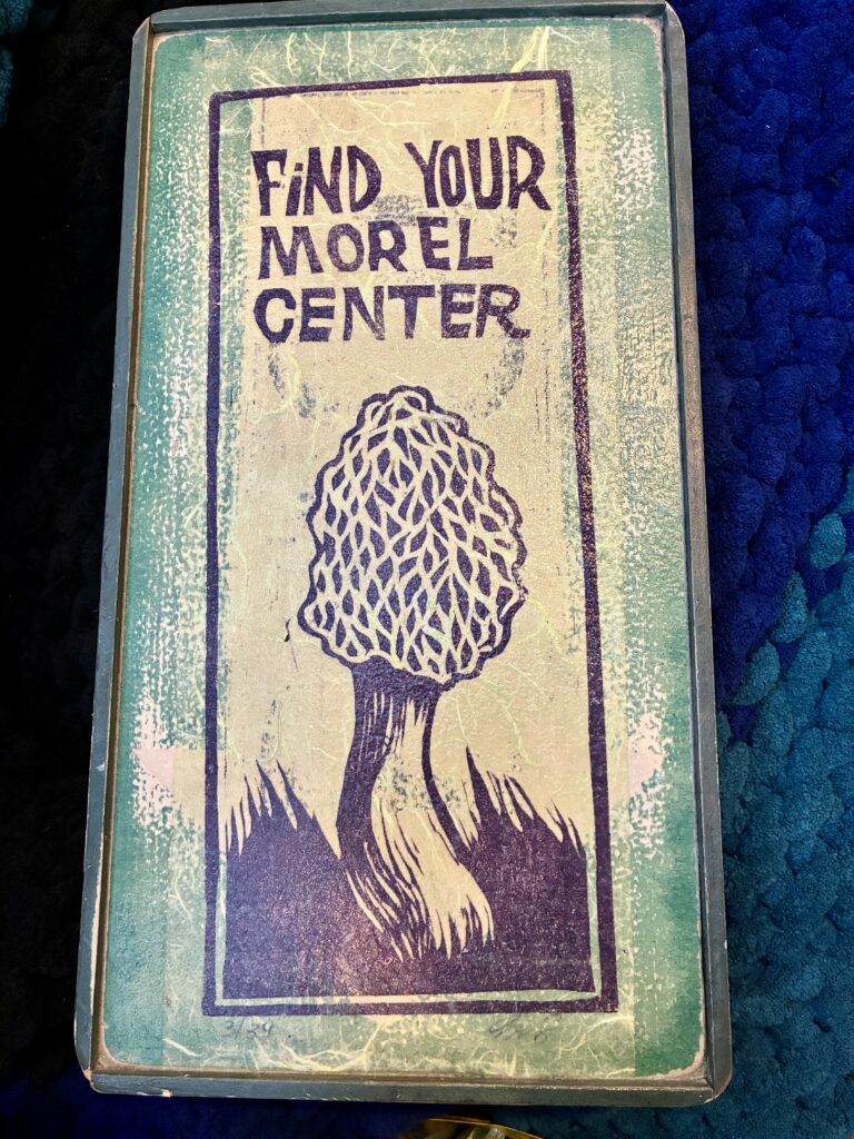 ‘Morel Center’, 2025. 8″x 14.5. Mixed media and acrylic on wood with water-resistant seal. $40
