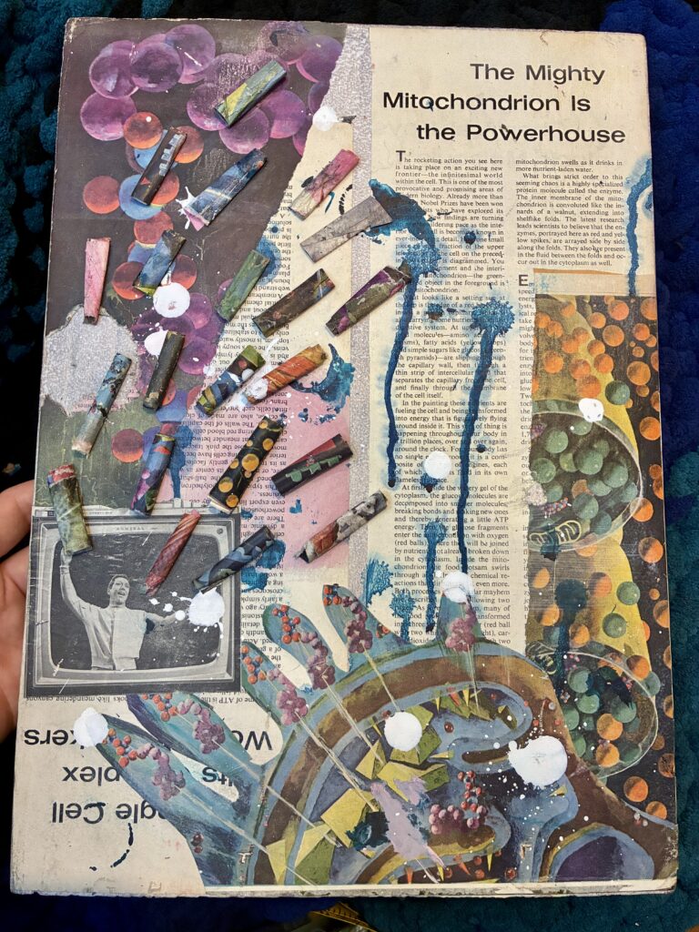 ‘Powerhouse’. 2025. 14″ x 16″. Mixed media and acrylic on wood with water-resistant seal. $50